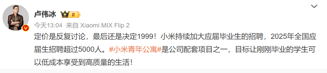 7月1日下午,雷军本人转发小米青年公寓相关信息,并表示:这是为小米年轻工程师打造的员工公寓,位于北京小米昌平园区附近,月租金1999元,一共2600套,应届生优先入驻。