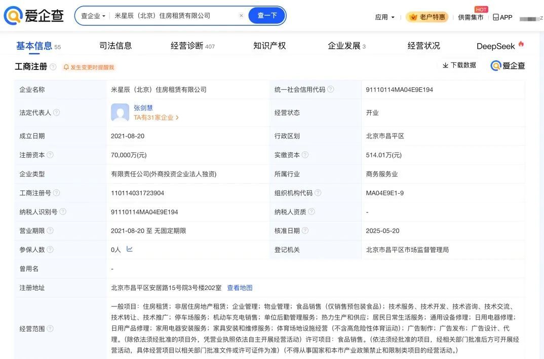 爱企查App显示,小米员工公寓关联公司米公寓(北京)商业运营管理有限公司成立于2021年8月,法定代表人为张剑慧,经营范围包括住房租赁、非居住房地产租赁、企业管理等,由小米通讯技术有限公司全资持股。值得一提的是,近期,该公司更名为米星辰(北京)住房租赁有限公司,同时经营范围发生变更。